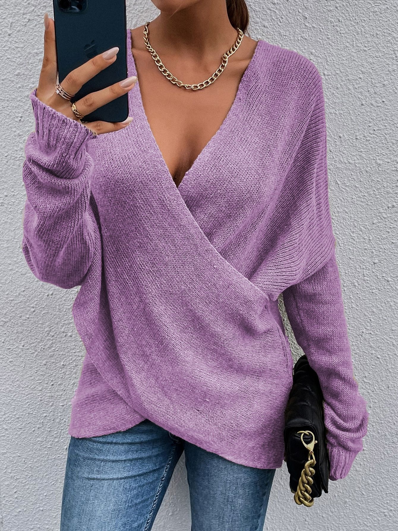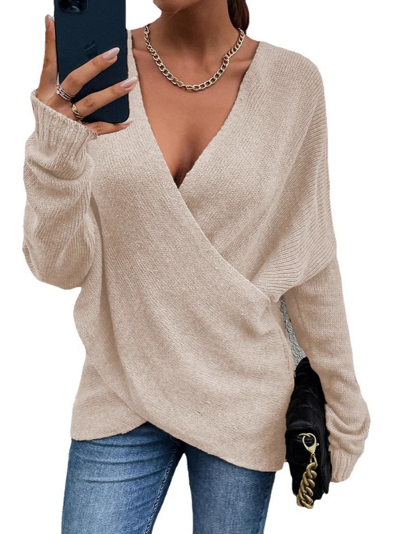 Sweter damski z dzianiny, jesienno-zimowy, z dekoltem w kształcie V i długimi rękawami